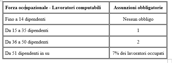 La Legge 68/99 che regolamenta l’inserimento obbligatorio di persone con disabilità nelle imprese, prevede i seguenti obblighi occupazionali: