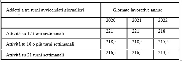 Nei casi di attività lavorativa continuativamente programmata per 17 o più turni settimanali, l’orario annuo è pari al seguente numero di giornate lavorative: