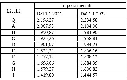 Per effetto degli aumenti fissati con decorrenza gennaio 2021 e gennaio 2022, i nuovi importi del trattamento economico minimo sono i seguenti: